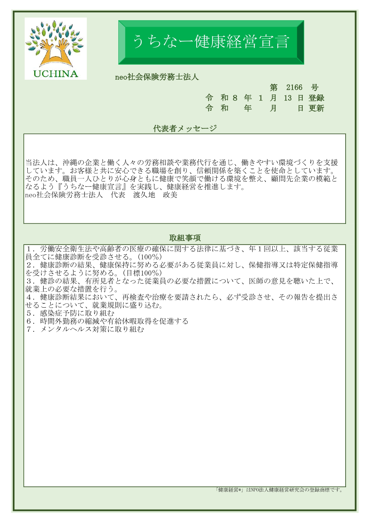 | 代表者 | 社会保険労務士 渡久地 政美〈Toguchi Masami〉 | 社会保険労務士 渡久地 政美〈Toguchi Masami〉 |